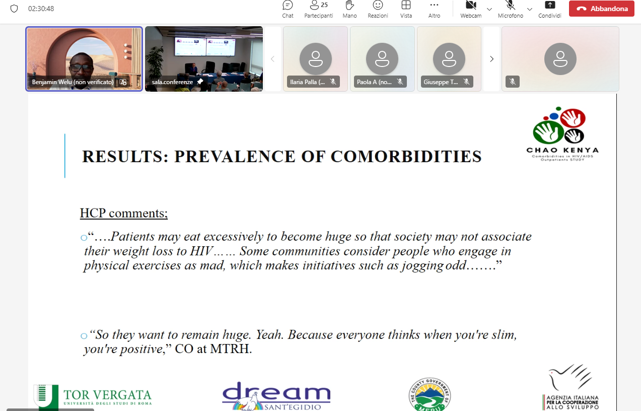 Il Dr. Benjamin Welu – Medico e ricercatore, Programma DREAM, Kenya – ha, invece, presentato i risultati dello STUDIO CHAO in Kenya, volto ad aumentare le conoscenze sulle comorbidità e sui principali fattori di rischio nei pazienti affetti da HIV, affrontando l’urgente necessità di migliorare la comprensione e la gestione di queste condizioni. Condotto tra novembre 2022 e ottobre 2023, lo studio ha coinvolto 1.051 pazienti con HIV+ in 25 cliniche della contea di Meru, Kenya. In particolare – sottolinea – il 55,4% dei pazienti esaminati era affetto da altre condizioni, con il 36,9% che presentava una comorbilità aggiuntiva e il 18,5% che ne aveva più di una. Ciò sottolinea la necessità di approcci di cura integrati. Lo studio evidenzia che le malattie non trasmissibili e i fattori di rischio associati erano nettamente più diffusi (38,5%) rispetto alle malattie trasmissibili (14,9%) tra questi pazienti.